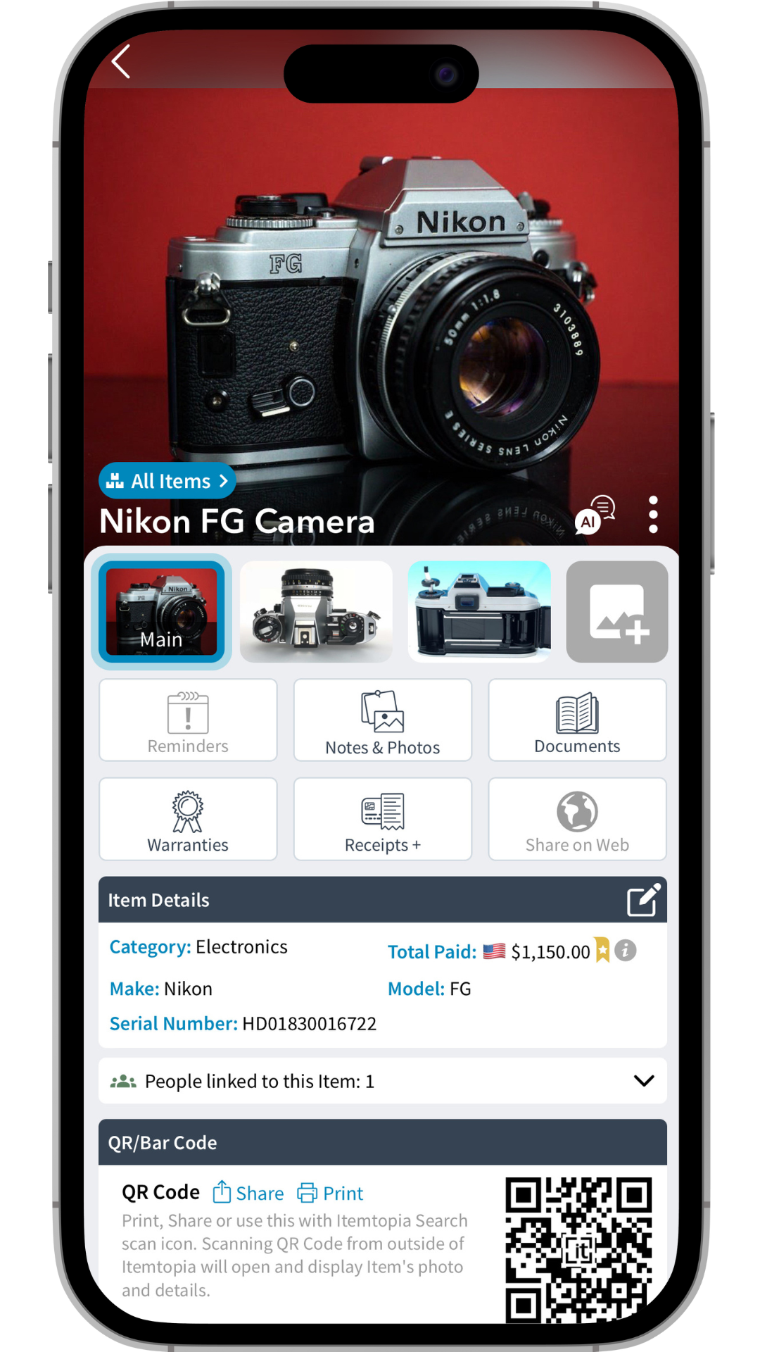 Track Item Details: Keep tabs on what you have, who has it, and where it is, as well as warranties, reminders, notes and purchase or maintenance receipts.